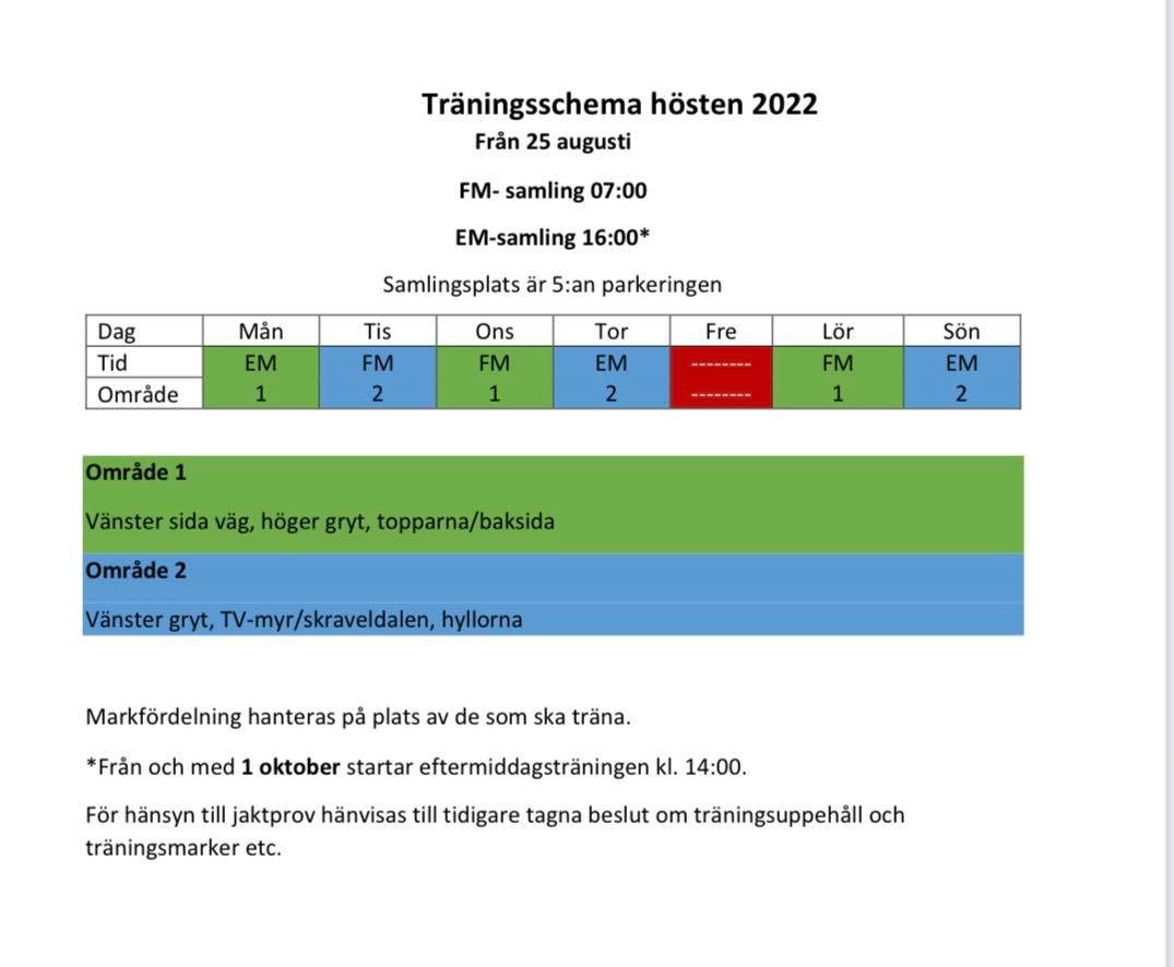 Från och med 1 oktober startar eftermiddagsträningen kl. 14.00. För hänsyn till jaktprov hänvisas till tidigare tagna beslut om träningsuppehåll och träningsmarker etc.